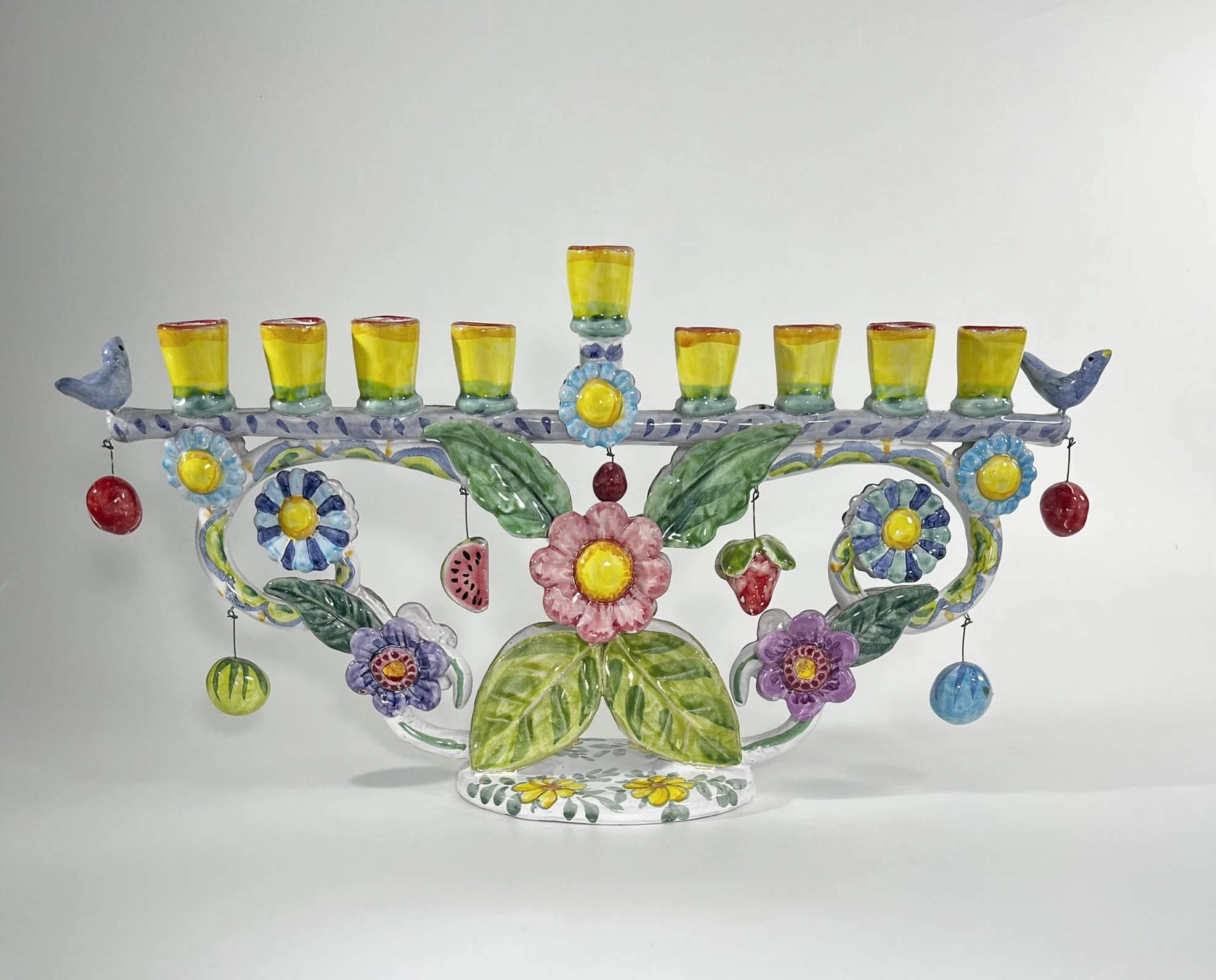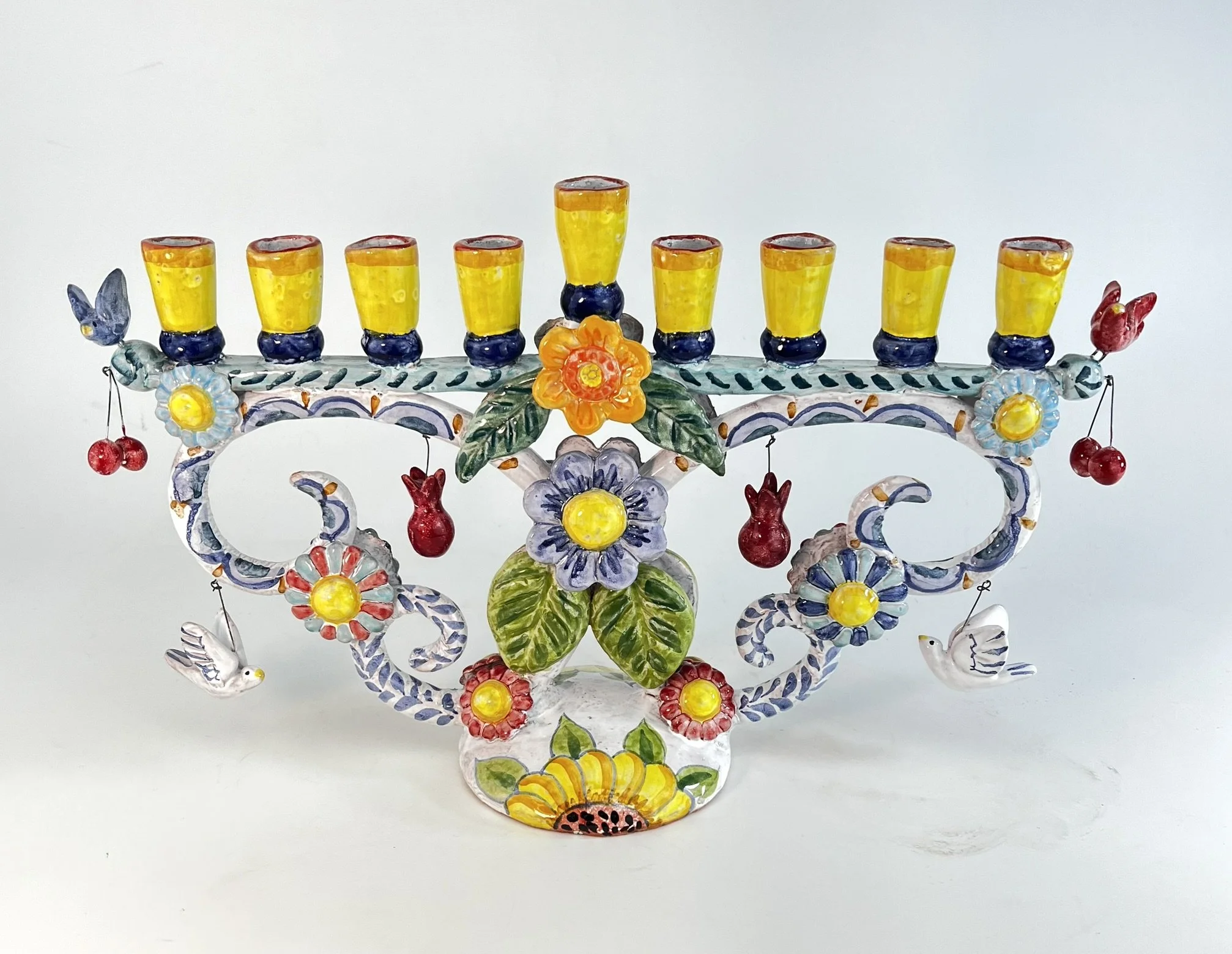 long menorah with yellow birds